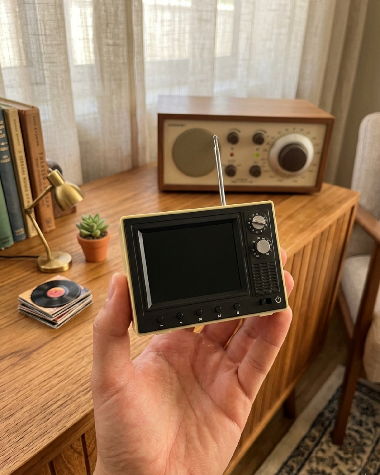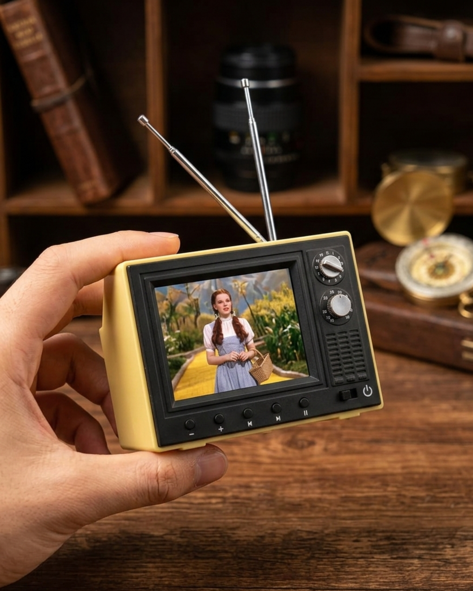 The VintScreen™ is a fully functional 1:12 scale vintage television that brings your favorite videos to life on your desktop. This retro-inspired gadget features a real LCD screen, built-in memory for video storage, and an internal battery that charges via USB. Measuring just 3.4 inches wide, it is the ultimate nostalgic centerpiece for any modern workspace or miniature collection.
